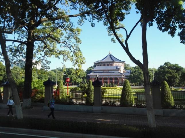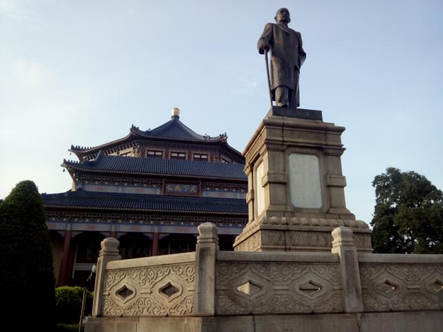 正面檐下,表里各八根大可三人合围的朱色水磨大石柱,拱托着彩绘的磨水石米斗拱、花梁和拼花图案的天花板。青铜大吊灯,悬在巨大的走廊半空,映着镂花丹门,衬托得殿堂越发的金碧辉煌,古色古香。现在,中山纪念堂是广州最具标性的修建物之一,也是广州市大型聚会和表演的主要场合,更见证了广州的很多前史大事……