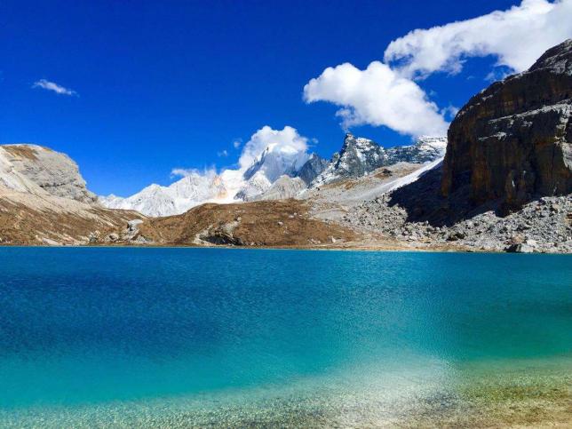 牛奶海是亚丁地区的圣湖之一,位于央迈勇神山下,海拔4600米。牛奶海湖水深浅不一,近岸由于湖底远久植物的沉淀而略显黑色,往里面一些则是浅绿色的一带,再深处则是碧绿色的水面,蓝得透亮。阳光照耀在静静的湖面上,水面如宝石般熠熠闪光。