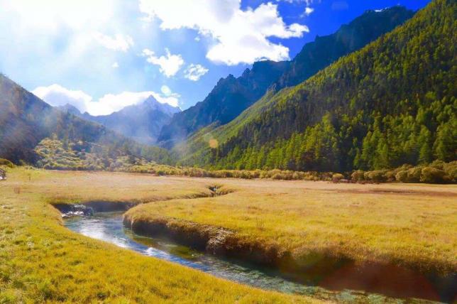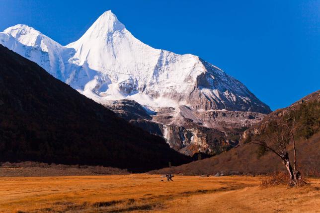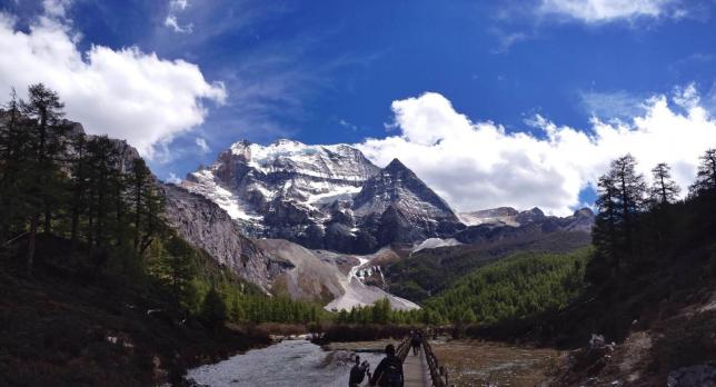 站在央迈勇峰下,转身向后瞧去,由群山环绕着的宽阔峡谷间,森林、草地、溪流和睦地各守一方,央迈勇峰则像娴静端庄,冰清玉洁的少女,洁白而巍峨,显得神圣而庄严,这气势莽莽的自然景观,俨然一处不食人间烟火的世外桃源。