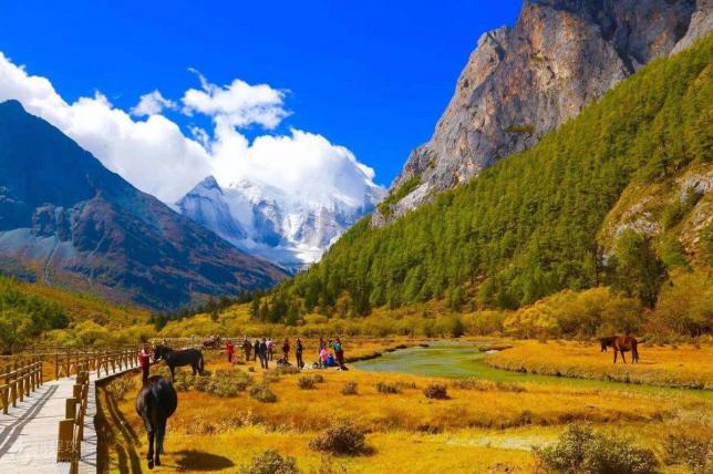 洛绒牛场是亚丁自然保护区著名景点之一,海拔4150米,是附近藏民放牧的牧场。洛绒牛场背靠三座神山,是观赏三怙主雪山的最佳地点。