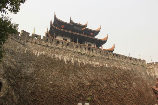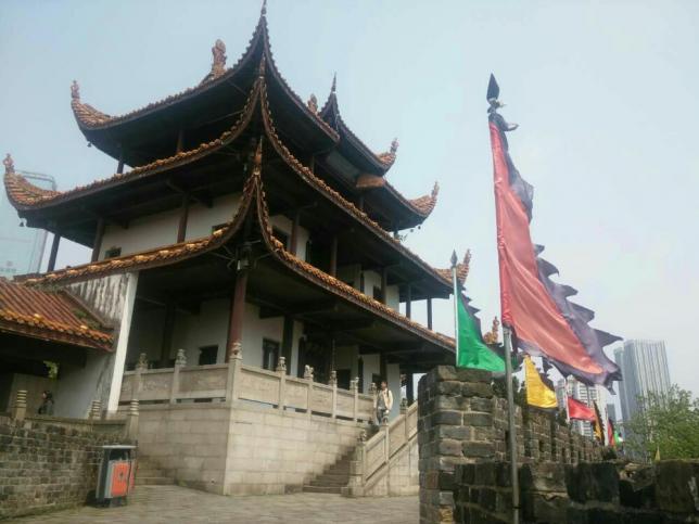 天心阁是长沙古城的一座城楼,周边的城墙,是长沙仅存的一段古城墙。天心阁整体建筑用四十六根红漆圆柱支撑,栗瓦粉墙,灰白色石基敦厚稳实,阁前、后的石栏杆上雕有62头石狮,阁体上挂着32只风马铜铃,迎风作响。