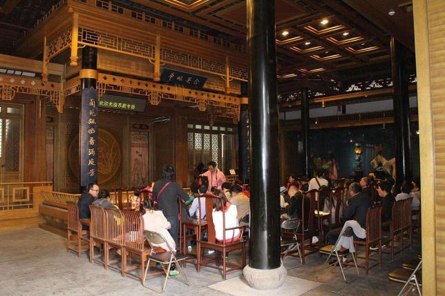 室内戏厅是昆曲展演的主要场所,观众席复原明式厅堂陈列,明式家具、匾额、对联,铺上红氍毹,组成明代厅堂红氍毹演出形式。