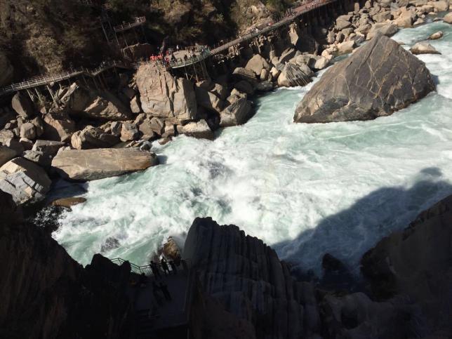 丽江虎跳峡景区内的栈道非常平整,走起来很轻松,更适合一家老小出行,休闲游玩。如果实在体力不支,还可以乘坐景区的人力车。从丽江这边也可以看到江对岸香格里拉虎跳峡的步道,如果体力充沛,推荐去香格里拉虎跳峡徒步,会别有一番感受。