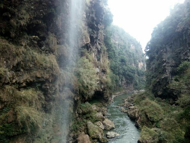 马岭河峡谷距兴义市约4公里左右,峡内,河水清澈,晶莹透锡,客人漂流,乐此不疲,峡侧,彩崖峡迎风而立,灰色的石崖布景中分布着一道道桔红、灰白、绛紫、果绿各种色彩或粗或细或长或短的线条,故名曰:彩崖峡。