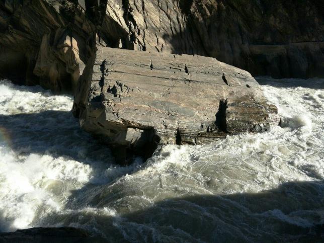 巨石犹如孤峰突起,屹然独尊,江流与巨石相互搏击,山轰谷鸣,气势非凡。站在江边,惊涛骇浪在深谷中激荡奔涌,置身谷底,感觉是另一个时间,另一个世界。