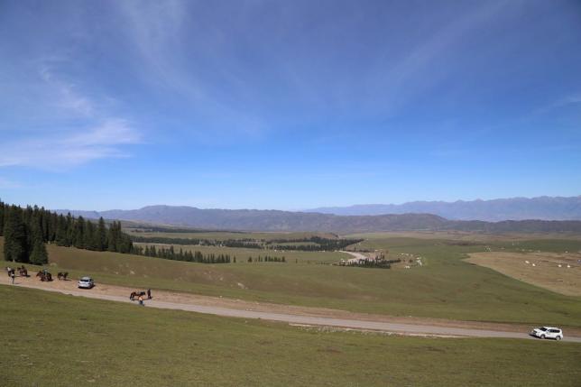 那拉提草原是新疆最著名的草原之一,6-9 月此时的草原一片碧绿,还有野花盛开,而且气候适宜。那拉提草原东南接那拉提高岭,势如屏障,西北沿巩乃斯河上游谷地断落,地势大面积倾斜,山泉密布,溪流纵横。