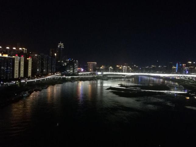 万家民居灯火为背景,层见叠出,构成一片高下井然、错落有致、远近互衬的灯的海洋。车船流光,不停穿梭于茫茫灯海之中,依稀飞起汽笛、欢笑、笙歌之声,给夜中城平添无限生机。更兼两江波澄银树,浪卷金花,满天繁星似人间灯火。