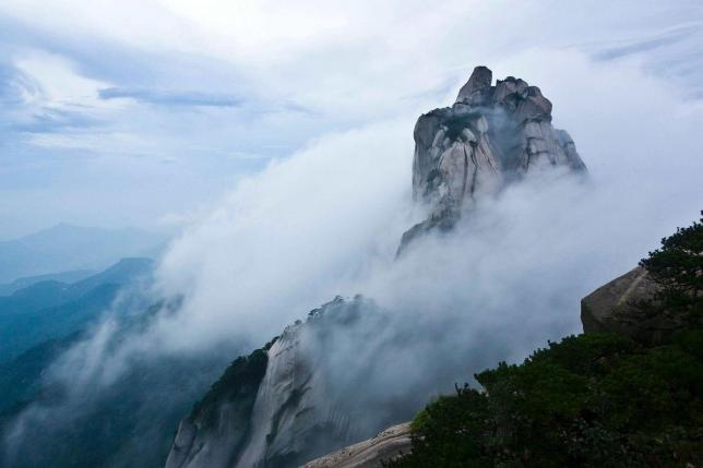 从天柱山开始进入大别山山脉,一路穿山越岭,我们接近了“天堂寨”。到达烟灰暮色笼罩山间,山脚的“天堂山庄”,看得见巍巍青山,听得见淙淙水流。修筑的山道并不难走,只是崇山峻岭,连绵起伏看不到尽头。峰回路转,看见一瀑挂前川,名曰“九影瀑”,可谓寨中之水天上来。接着泻玉瀑布、银弓瀑布,气势磅礴,一瀑一洞天。另一条路是通向秀水谷景区,据说峡谷风光也是绝佳。走了一半,放弃了攀登,乘索道而上,半个钟头享受空中滑翔,五颜六色的缆车平稳向前,1500米的行程壮丽无比,与山水之间构成一道独特的风景。