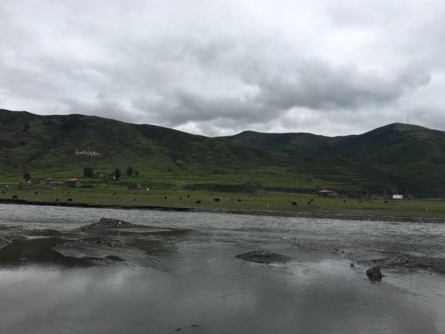 新都桥镇,俨然就是一片世外桃源,山峦连绵起伏,藏寨散落其间,牛羊安详地吃草。