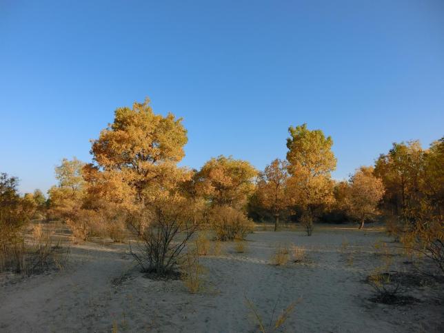 金塔胡杨林,金秋十月的胡杨,绿色的树叶有的已经变黄,在湛蓝的天空下,在荒芜的沙漠中,如阳光一般明媚灿烂。