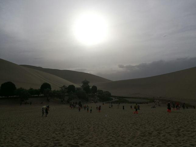 鸣沙山月牙泉,月牙泉处于鸣沙山环抱之中,泉形酷似一弯新月,泉被鸣沙山四面环抱,但并不为流沙所掩,始终碧波荡漾。