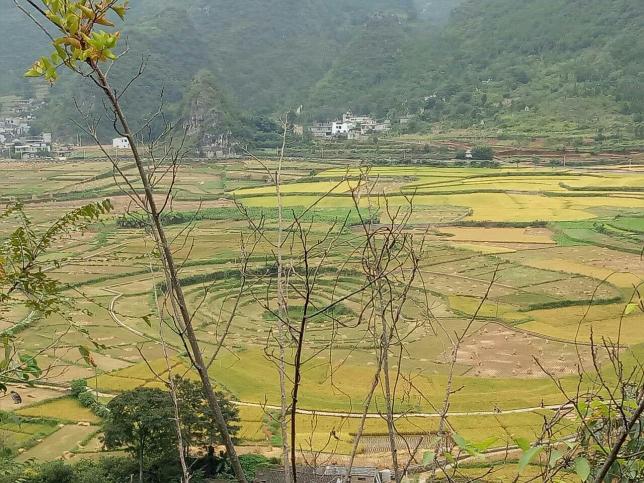 中国锥状喀斯特博物馆,秋天时,一块一块的稻田金黄,在大地上一圈一圈地编织出金色的锦绣,与延绵的峰林,互相映衬,组成这秋日里最诗意的田园画卷。