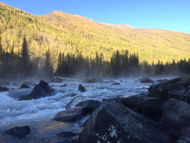 在国庆旺季来临之前,来饱览这里的秋色:天高云淡,蓝天如洗,层林尽染,满目流金。山林犹如画屏,分布各异的林带呈现层次分明的颜色,烘托着山顶耀眼的雪白,投映在翡翠石般的喀纳斯湖面,形成一幅光彩夺目的画卷。