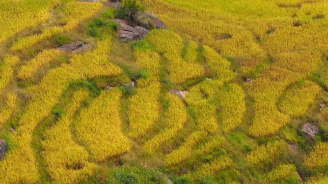 在““世界梯田之冠”看金色稻浪,金秋时节,被誉为“世界梯田之冠”的龙脊梯田,稻穗沉甸,像座座金塔顶玉宇。