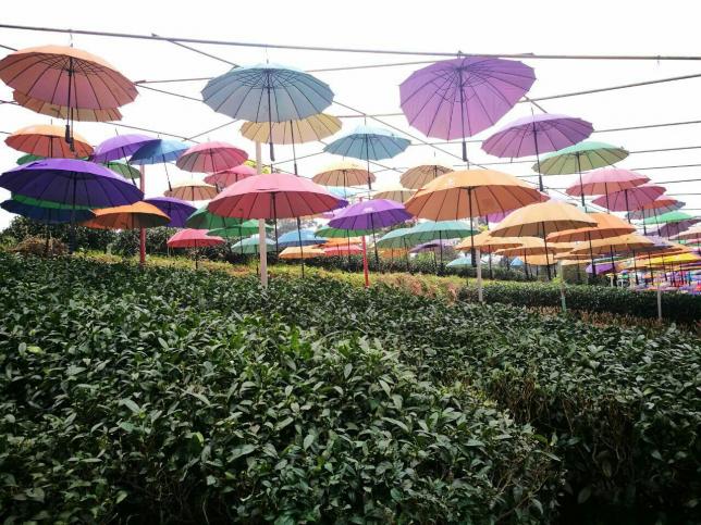 一栋栋云雾缭绕的彩色房屋,错落有致呈现在翠色欲滴的茶园间。在一片碧绿间,这些彩色的房屋就像夜空中的星星,十分美丽。