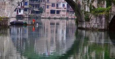 云雾萦绕山间,一叶小舟飘在江面,静如止水,又震撼心灵。
