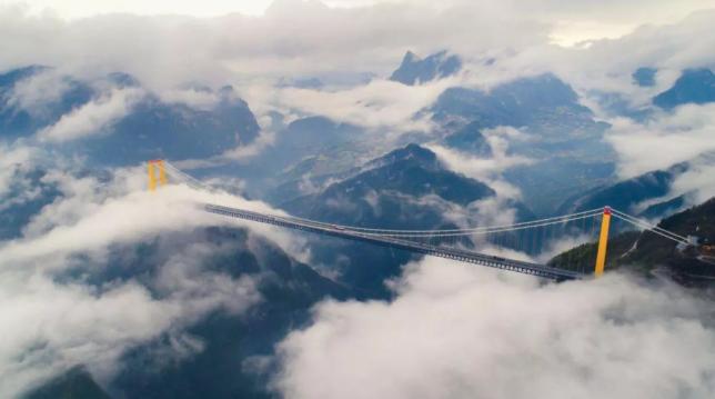 四渡河大桥是世界首座跨度达900米以上的山区特大悬索桥,塔顶至峡谷谷底高差达650米,桥面距谷底560米,相当于200层楼高。遇到云雾绕山的时候,便如同置身仙境。