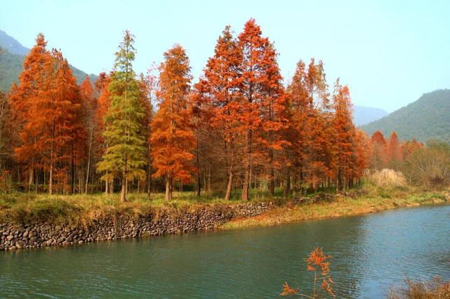 在浙江临海深深的山坳里,居然隐藏着一片让人为之惊叹的红杉林。一棵棵红杉树高耸入云,浅红、深红、金红多种色彩交织在一起,倒映在碧波荡漾的河面。行走在树林之中,脚下厚厚的草坪上时不时出现斑驳的影子,迷幻的色彩,宁静的时空,宛如游走在一幅静止的美丽画卷之中……万山红遍,层林尽染,整齐排列的红杉树,一棵棵高耸入云,在初冬的日子里,红得很彻底。