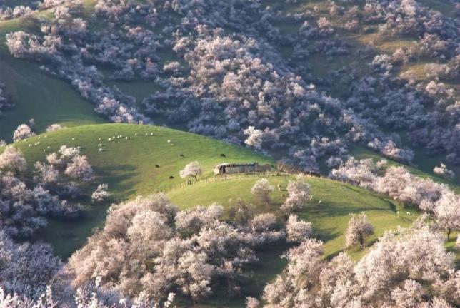 新疆伊犁野杏林,属于最原生态的美景,在辽阔的山谷中,峰峦叠起,杏花遍野。是多么的美景啊。