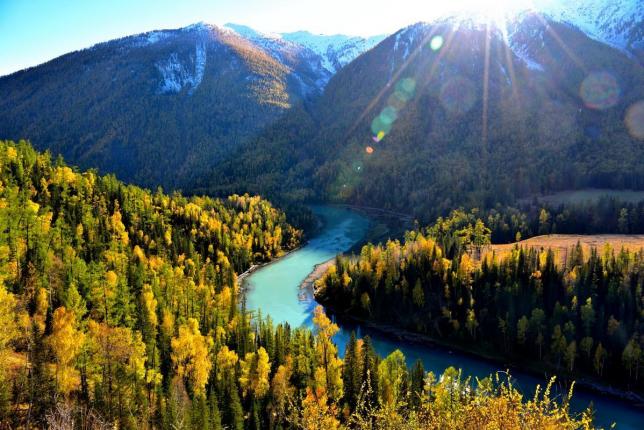 喀纳斯是亚洲唯一的瑞士风光,具北国风光之雄浑,又具有南国山水之娇秀,加之这里还有“云海佛光”、“变色湖”、“浮木长堤”、“湖怪”等胜景、号称是西域之仙景,油画中的世界。不同的植物群落层次分明,色彩各异。每至10月中至11月中是喀纳斯的纯金时节。天高云淡,蓝天如洗,层林尽染,满目流金,深绿的山坡上透出一片片黄枝红叶相间、青山白雪相连的色块,投映在翡翠石般的喀纳斯湖上,光彩夺目,令人沉醉。