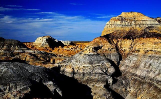 五彩城位于新疆古尔班通古特沙漠东部的吉木萨尔境内,典型的雅丹地貌。五彩城方圆约3平方千米,是由深红,黄,橙,绿,青灰,灰绿,灰黑,灰白等多种色彩的泥,页岩互层构成的低丘群。