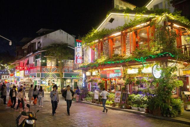 西街是阳朔最有历史的街道。西街始建于1674年,它用本地产的槟榔纹大理石铺成,暗青油亮路,两旁是清代遗留的低矮砖瓦房,白粉墙红窗,透着岭南建筑的古朴典雅。西街是年轻人的世界,满街文艺气息,两个娃看得眼花缭乱,喜欢的不得了。