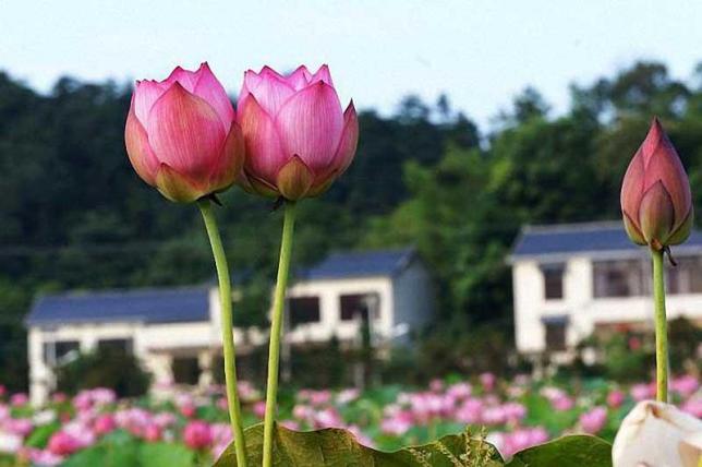 光明村有大片的荷池,花朵映着民居,份外美丽。