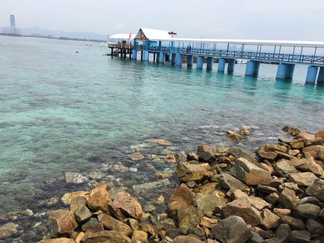 观海长廊:在蜈支洲岛西侧,沿海边地形修建了木质走廊和平台,可以沿着走廊观看蜈支洲岛清澈的海水,这一带因为礁石比较多,所以可以看到很螃蟹在礁石上"行走",如果运气好,在平台上还可以看到成群的热带鱼。