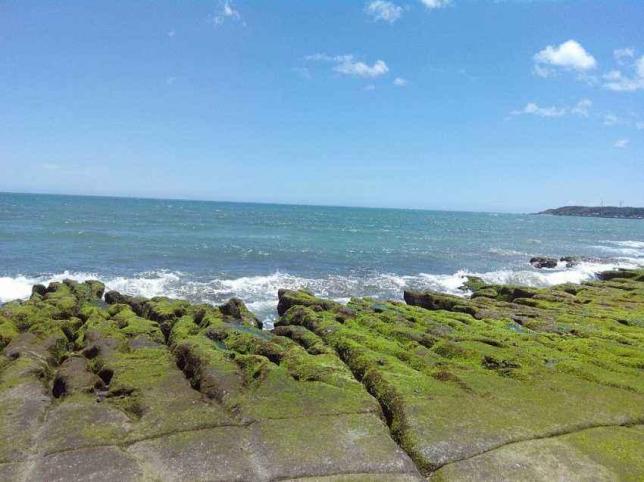这个地方,别说外地游客鲜有人知,就连当地人都来得很少。在沙滩与海水之间,长满绿色的岩石,形如搓板般铺排开来,而蓝色的海水一浪浪涌来,构成了最独一无二的风景。