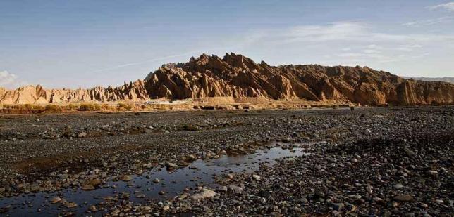 盐水沟是一条穿越确尔塔格山的干涸河床,因山沟的水流含盐量高而得名。盐水沟也是古丝绸之路的故道,是龟兹古国通向姑墨国的咽喉地带.沿途可见建于汉唐的关类遗址数座,是昔日客商、军旅、佛教徒们穿梭于丝绸之路的历史见证。