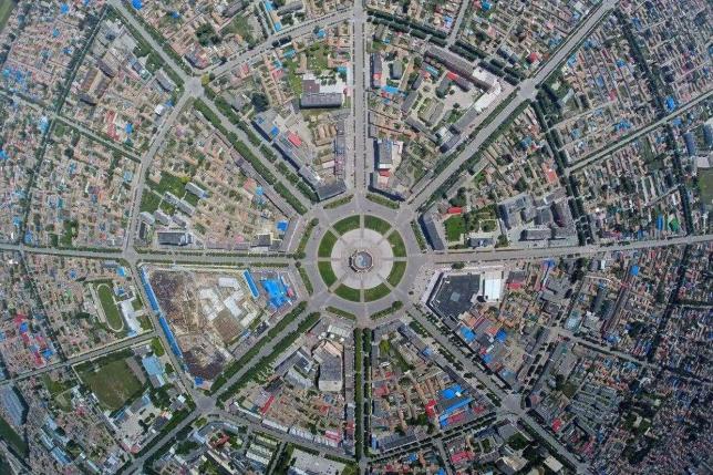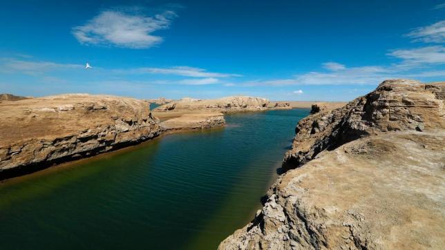 每年冬天,雅丹土丘与蔚蓝的湖泊冰面相互交融,形成一片50余平方公里的水上雅丹奇观。图为空中俯瞰,雅丹土丘与湖泊冰面相互交融,景色极美。