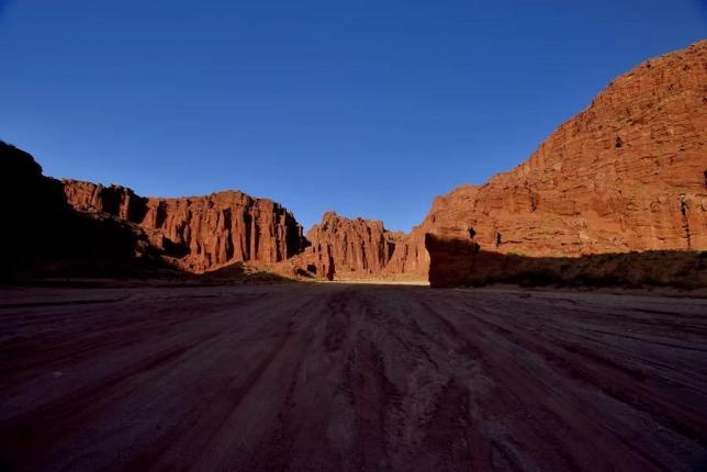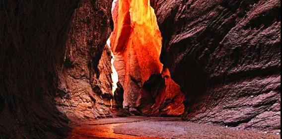 在阳光照射下,红褐色的山体群犹如一簇簇燃烧的火焰,进入谷内,在红褐色的山峦中步行,仿佛进入了一个幽静清凉的世界。
