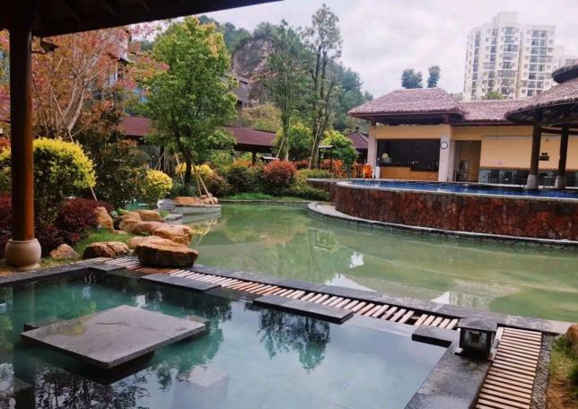 黔贵六广温泉,室外温泉泡池区共有形态、大小、水温各异的特色室外泡池30余个。温泉酒店配套多间高档客房,有江景房、复式家庭套房、行政套房等特色房间。