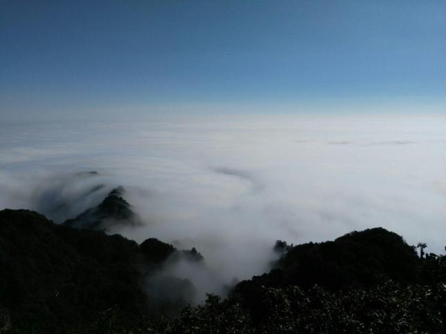 从山顶望去,雪后的大洪山无论是山还是建筑都是银色的,浓浓的云海滚滚而来,已经分不清是山还是海。
