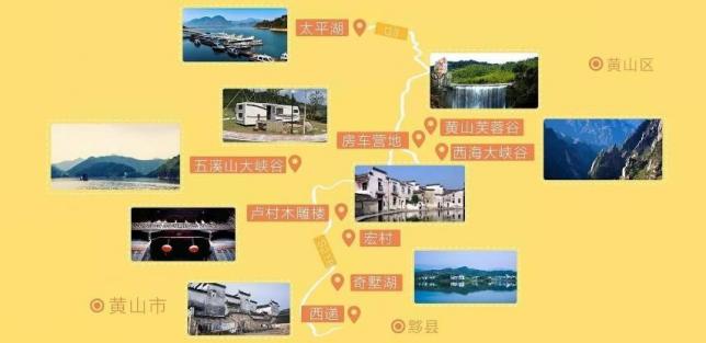 沿途景点:太平湖风景区—黄山芙蓉谷景区—西海大峡谷—奇瑞途居黄山露营地—五溪山大峡谷—黟县卢村木雕楼景区—奇墅湖—宏村—西递古村景区