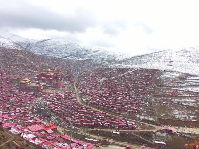 色达佛学院,“世界第一”规模的佛学院,僧舍非常壮观,数千间绛红色的藏式平房连绵几公里,形成了一座壮观的小山城。