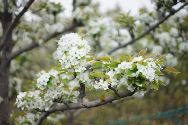 4月正是梨花盛开时节,远远望去,那一簇簇雪白的梨花,如团团云絮,漫卷轻飘。