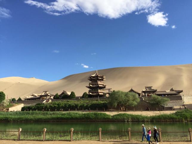 月牙泉处于鸣沙山环抱之中,因其形酷似一弯新月而得名。古称“沙井”,又名“药泉”,一度讹传“渥洼池”,清代正名“月牙泉”。水质甘冽,清澈如镜。千百年来沙山环泉而不被掩埋,地处干旱沙漠而泉水不浊不涸,实数罕见。泉内星草含芒、铁鱼鼓浪,山色水光相映成趣,风光十分优美。