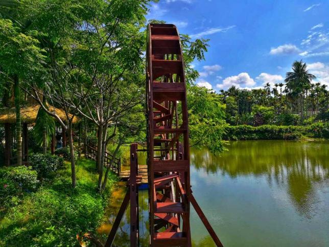 海南的每个村落都美得跟花园一样。水中槟榔树的倒影,再加上湛蓝天空中的朵朵白云,便是一派迷人的田园风光。在湖光碧影中吸引了小样的,反而是路边的菠萝蜜树。北方的孩子第一次见到还长在树上的菠萝蜜,充满了兴奋和好奇。村子里还设有专门的骑行绿道,若是时间充足,叫上三五好友,骑车缓行,定会更加惬意。