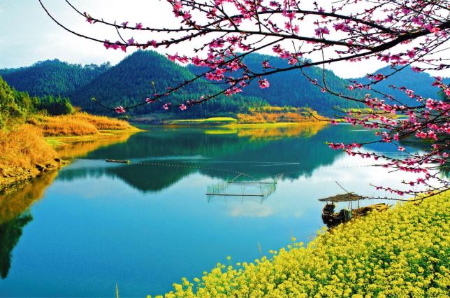 湖周群山环抱,湖水清冽,间有画若棋盘的田畦,疏密错落的茶园,一幅纯自然的田园风光图。万亩竹海环抱温泉,清新迷人。