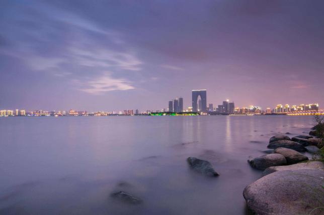 金鸡湖分为八个景观区:湖滨大道、城市广场 、水巷 邻里、望湖角、金姬墩、文化水廊、玲珑湾和波心岛。夜晚的金鸡湖流光溢彩,位于城市广场的水景系统有音乐喷泉 、水幕电影、激光、喷火等多种灯光效果,每逢节假日都会进行水景表演。