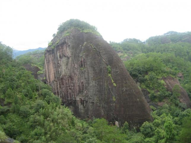 玉女峰与大王峰隔溪相望,像一对脉脉含情的恋人。东侧的圆石如镜,像玉女梳妆台,壁间“镜台”二字,是武夷山最大的摩崖石刻。
