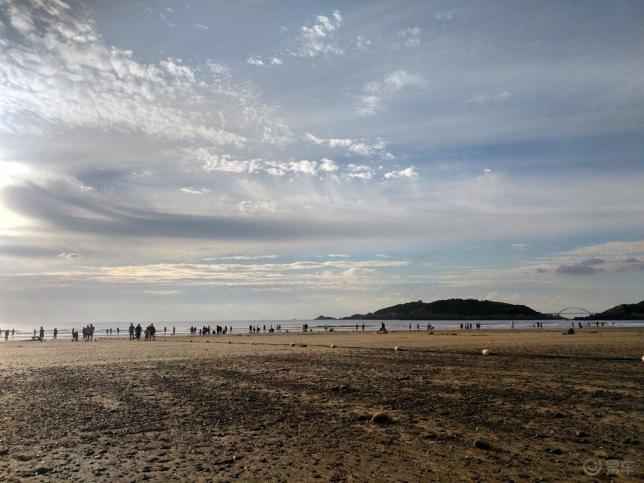 位于玉环坎门镇,居于城镇中心而又背山面海,两侧礁石景观别具一格。沙滩坡度平缓,沙质较细,干沙较少,略有细泥,是天然的海滨浴场和风季最佳的观潮区。每至夏季,去海滨浴场游泳的男女老少络绎不绝。一入夜,沙滩上则更是一派热闹场景,海鲜大排挡、露天茶座吸引了大批的游客前来纳凉、休闲。