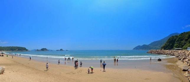 位于内九龙山风景区,背依青山,南面大海,三面环山,形似新月,沙滩长1500米,沙质坚净,它的沙是铁板沙,正因为有这个特点,夏日里前来游泳嬉玩的人多如牛毛,有的在捡拾海螺,挖着泥蟹,有的在追逐浪花,还有的静静地躺在沙滩上,看蓝天白云,听汹涌涛声。