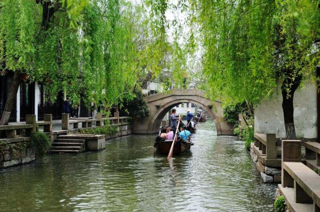 周庄古镇四面环水,因河成镇,依水成街,以街为市。井字型河道上完好的保存着14座建于元、明、清各代的古石桥。坐在船上游览,穿桥过洞,也是颇有一番情趣。