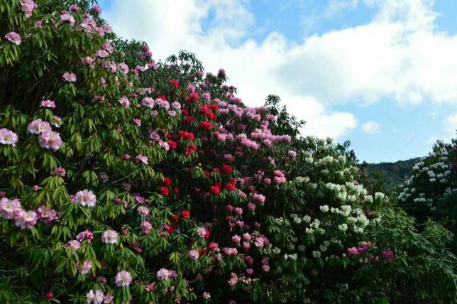 毕节的天然杜鹃花林带绵延百里,每年阳春三月,各种杜鹃争相怒放,绚烂花海形成一副宏伟壮阔的画卷。这里最为难得的是一树不同花,即一棵树上开出不同颜色的花朵,最多的达7 种之多,令人为之惊叹。