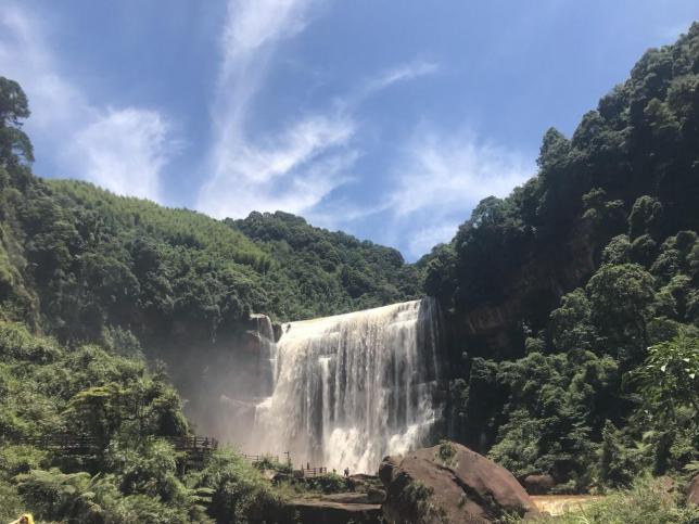 奔腾的白水河在这里从悬崖绝壁上直泻而下,形成九级瀑布,水雾经阳光折射,五彩缤纷,变幻无穷,气象万千,风景极为壮观。