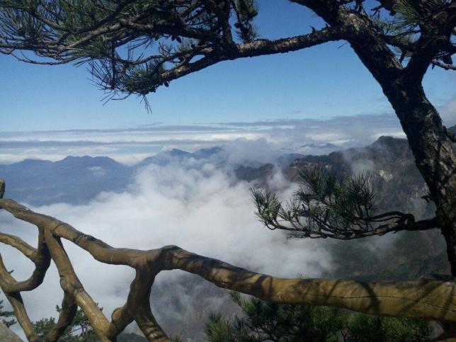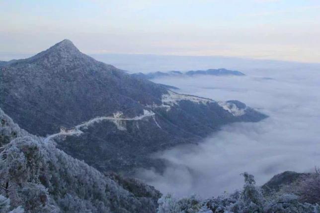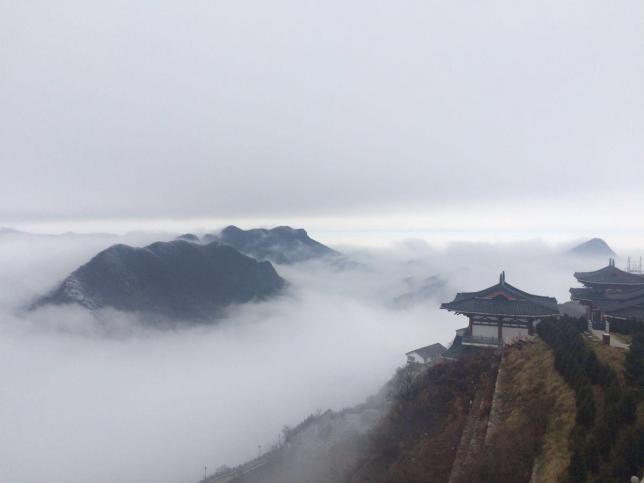 从山顶望去,雪后的大洪山无论是山还是建筑都是银色的,浓浓的云海滚滚而来,已经分不清是山还是海。