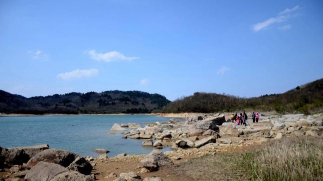 覆卮山主峰有海拔861米,第四世纪冰川遗址,由重重叠叠、浩浩荡荡的巨大鹅卵石汇成的石河呈“川”字形排列,蔚为壮观。在海拔500米左右的山腰上,有当地人开垦了700亩梯田水稻,一路自驾上山,车窗外便是壮丽的千年梯田美景,开满樱花的岭南山村时隐时现,令人陶醉。