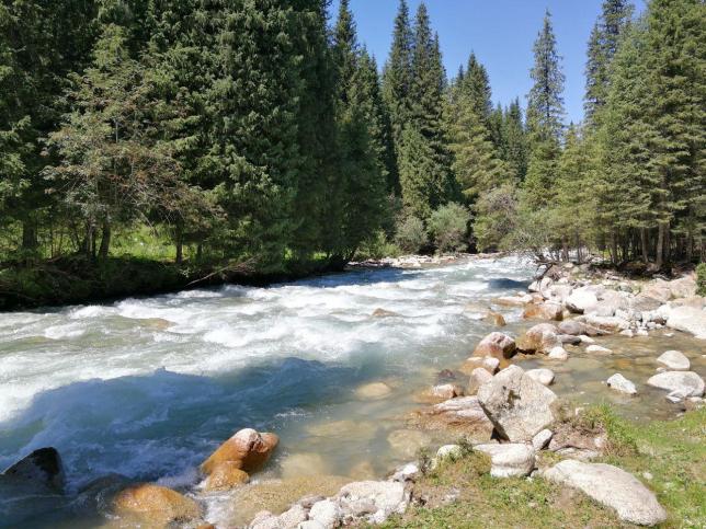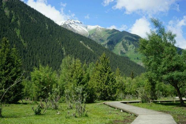 草原处处是画卷,远处,雄伟的天山支脉披着绿色的戎装,山下的丘陵上,马群、羊群在风中游荡、觅食。越往山里走,松林也越来越多。蓝天白云映衬着散发出泥土气息的青草,沿途的风景随着车子的移动随时变换着美丽的景致。